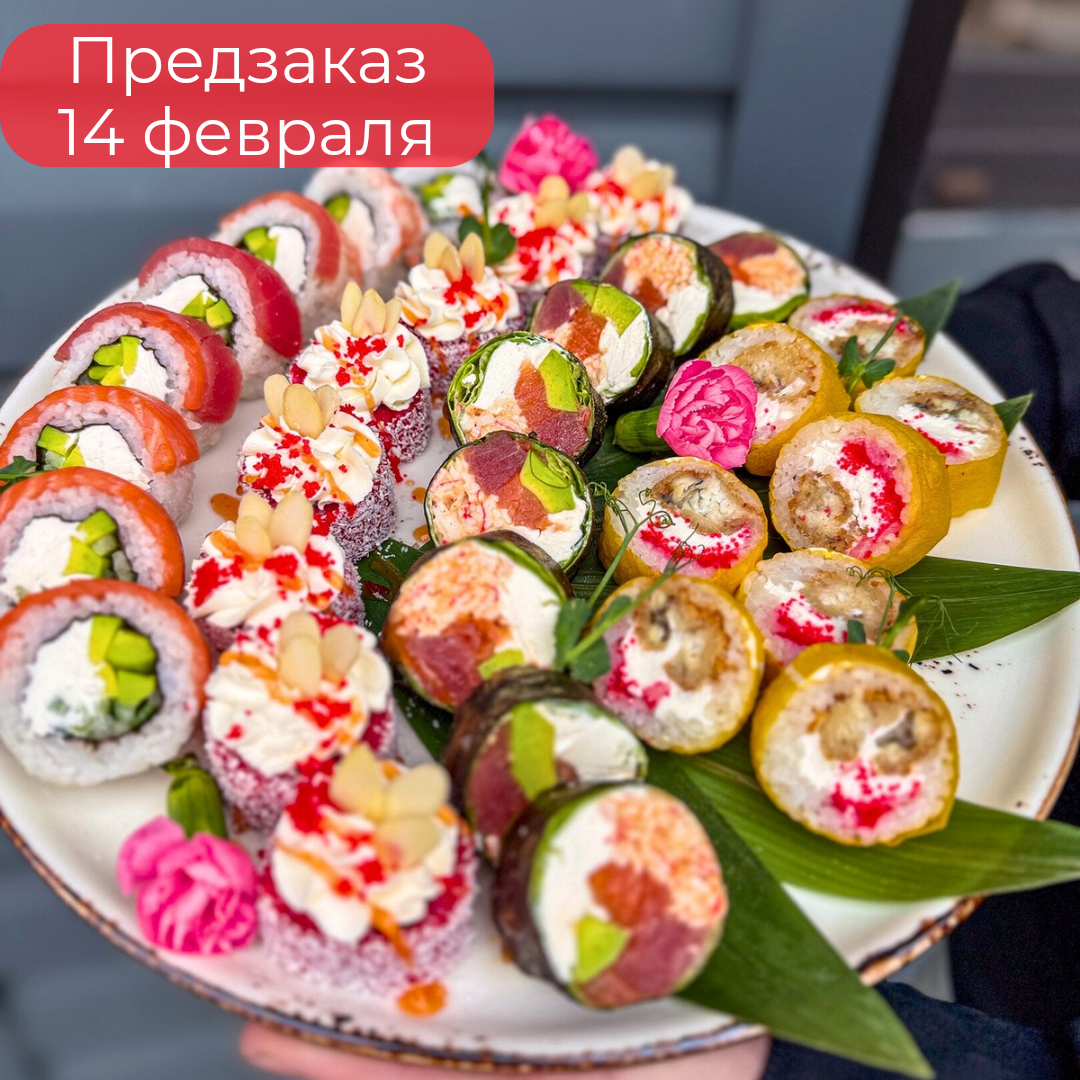 — Радуга: лосось, тунец, креветка, авокадо, сыр творожный, огурец, рис, нори.